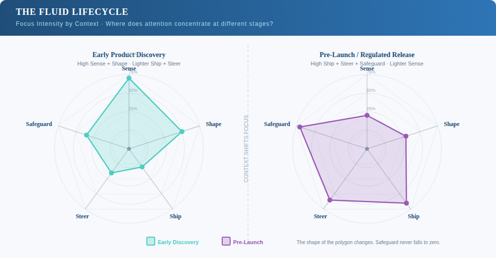The Fluid Lifecycle is a diagnostic first. If you map your current team against the five flows and ask which is being neglected, the answer will be clear and actionable. For most teams it is Sense. For AI-augmented teams, Safeguard is the second gap.